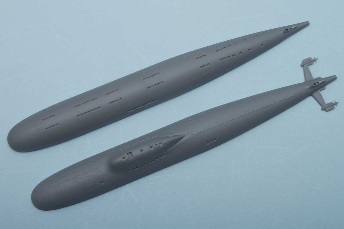 Jumping into the building of the kit, this is pretty straightforward. The hull is split into upper and lower pieces, with the upper half including the sail and the horizontal fins. The latter incorporate the small propellers that were used for slow speed maneuvering. Unfortunately, the propellers are molded in place and resemble little more than pegs. These are pretty small two-bladed propellers, though, so with some careful filing one could probably rework those into passable examples. Still, it would have been nice to see those on the photoetch fret.