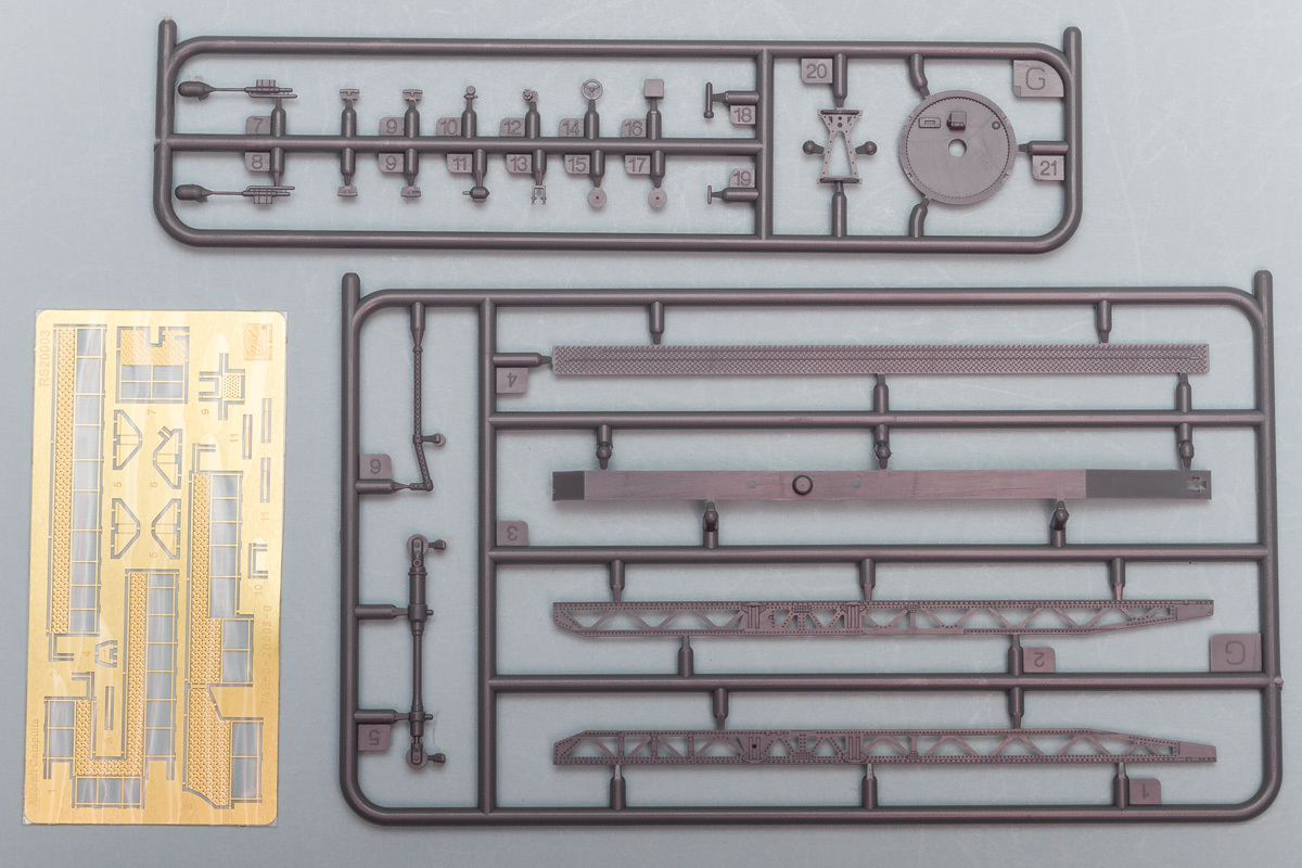 Moving on to the catapult, the majority of the parts are for this assembly. The main rail is made up from four separate side pieces, with a separate piston sandwiched inside. Onto this go all sorts of wheels and pulleys, as well as photoetch railings and walkways. The finished catapult assembly then fits down onto a large ring mount, which also gets some extra detailing in both plastic bits and photoetch. For final finishing, the kit provides decal markings for the Kingfisher, including the colorful red and white striped rudder.