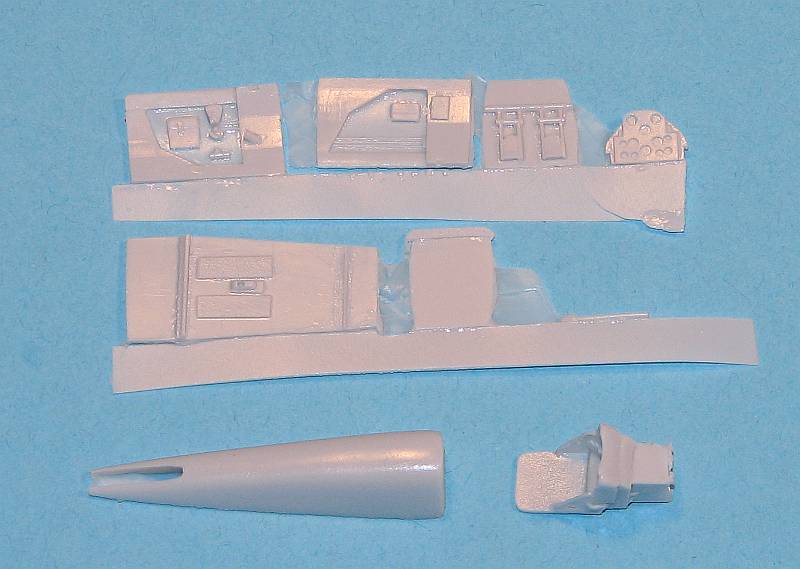 The cockpit consists of two sidewalls, a cockpit floor, a front and rear bulkhead, a seat with seatbelts molded in situ, an instrument panel and the control stick. The BFC-2 conversion consists just of the replacement turtledeck.
