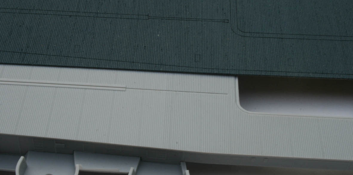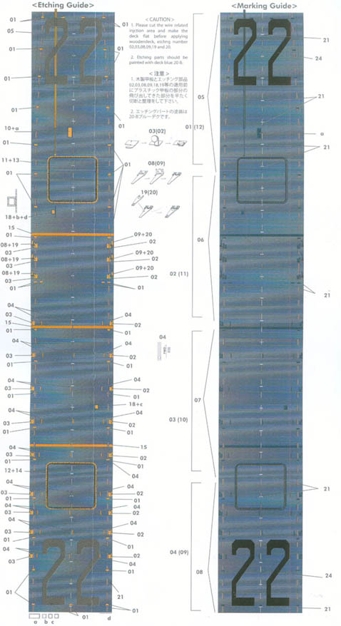 Additionally, between her first and second war cuises, the two-gun 20mm gallery was removed and replaced with a "plug' in the gap it had created in the starboard parking platforms, creating one continuous platform. This piece is not provided, but should not be too difficult to create in thin styrene. The piece itself was not pierced as the other pieces were, so the difference in appearance would actually be correct.
