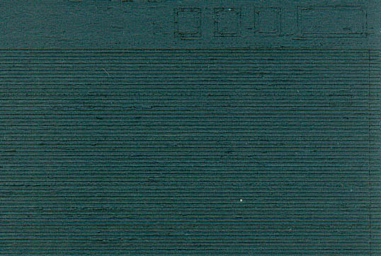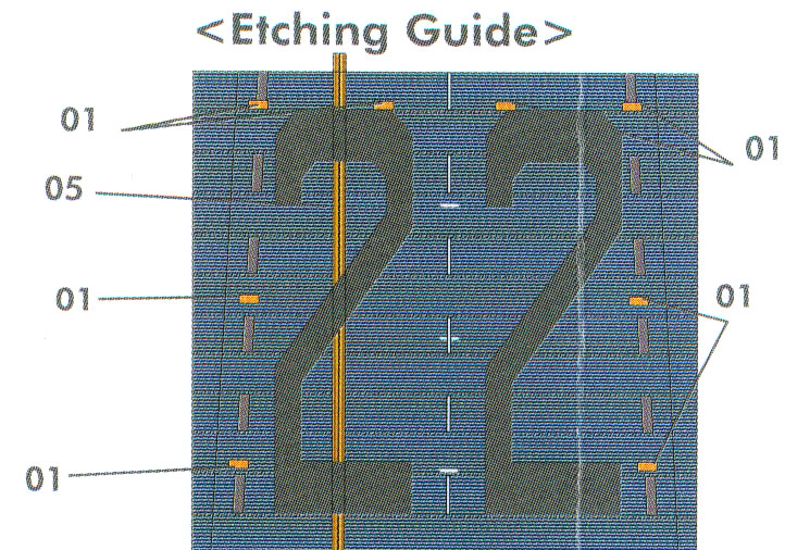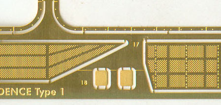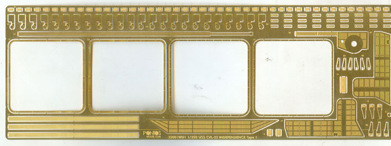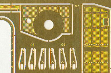 The photo-etch fret provices many relief-etched details to fit on top or aside of the deck. The parking aprons outboard of the deck were fabricated with a pierced steel decking which is lacking in the plastic piece, but well rendered in the photo-etch. Similarly detailed pieces are included for the crane platform forward of the island and elevator joints. Also provided are replacement arrestor reels, barricade flippers, single catapult track, and expansion joints.