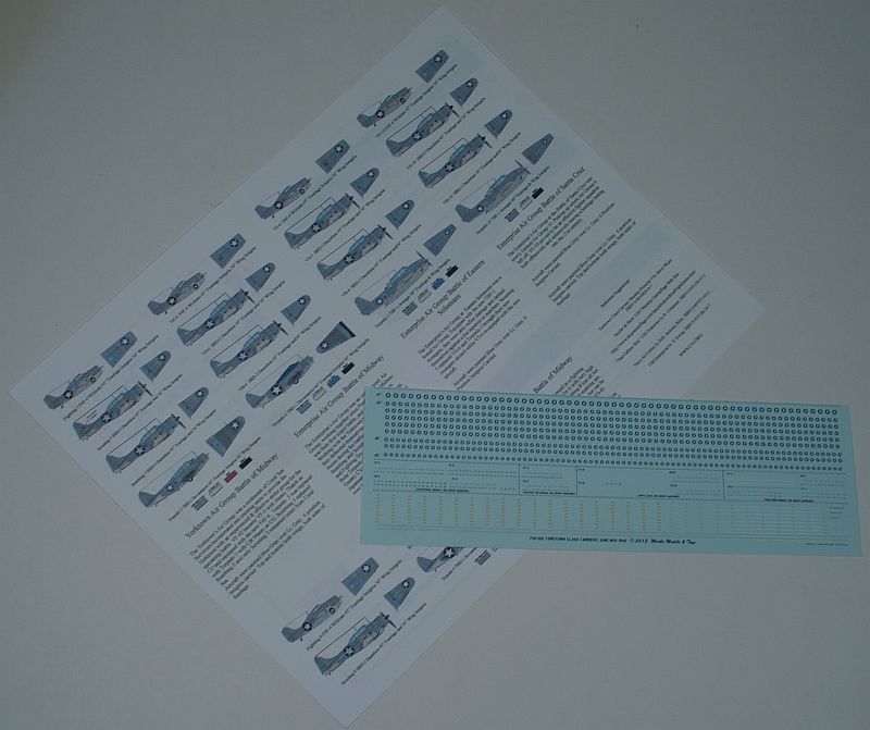 Where this set really shines is in the decals and instructions for the various air-wings attached to each ship during a specific time frame. There are decals for Wildcats, Dauntlesses, Devastators and Avengers. The decals are spelled out for: