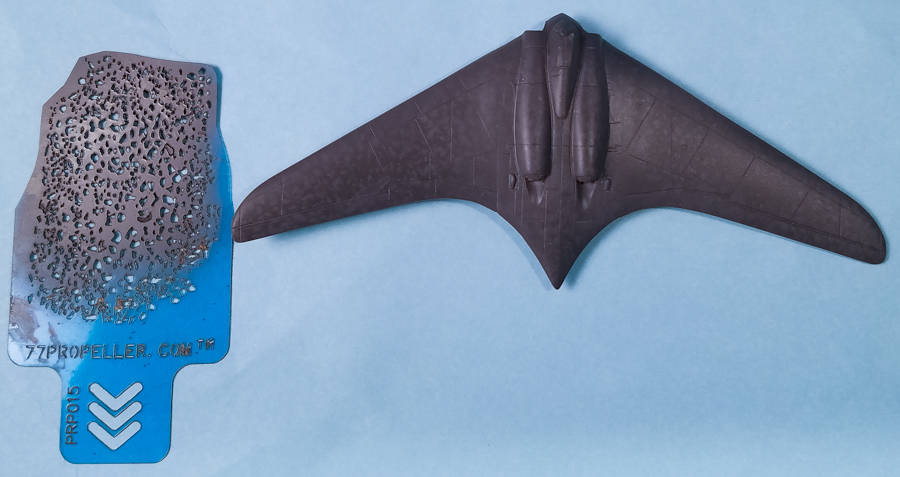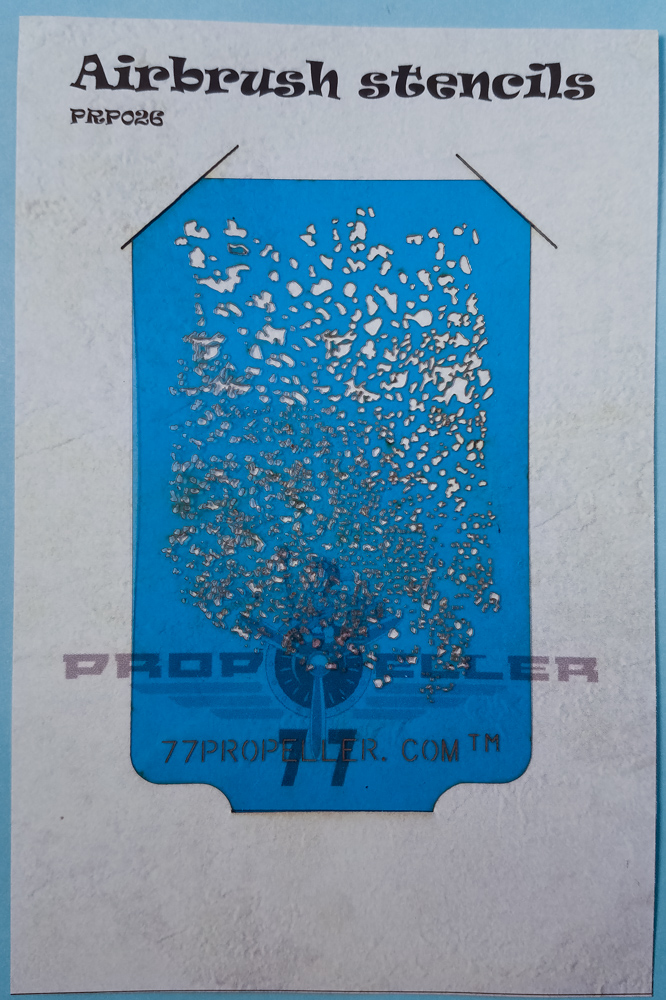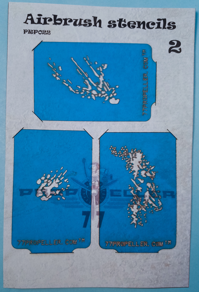 When I decided to finish the Brengun 1/144 Ho 229, and I chose a particular scheme, I was looking for a way to airbrush the usual German WWII "mottling" on a 1/144 model easily. There was one point I ventured to the LP Models site and while surfing around that site, I came across them selling the 77propeller stencils. I was leary, primarily because of the usual stencil size, but when I saw the stencils on the LP Models site (who no longer carries the 77propeller line) and specifically saw the smallest stencil, I thought it would work. So I contacted LP Models and he sent the stencils for review.