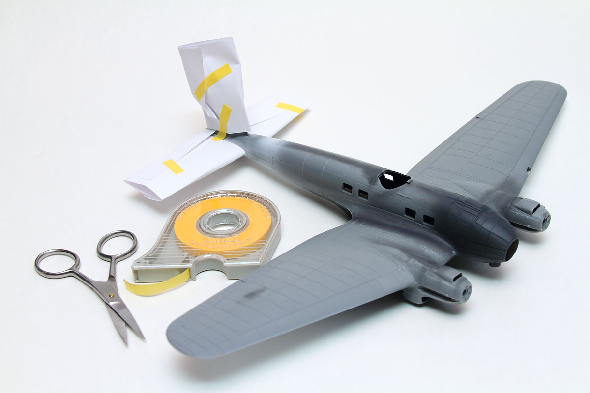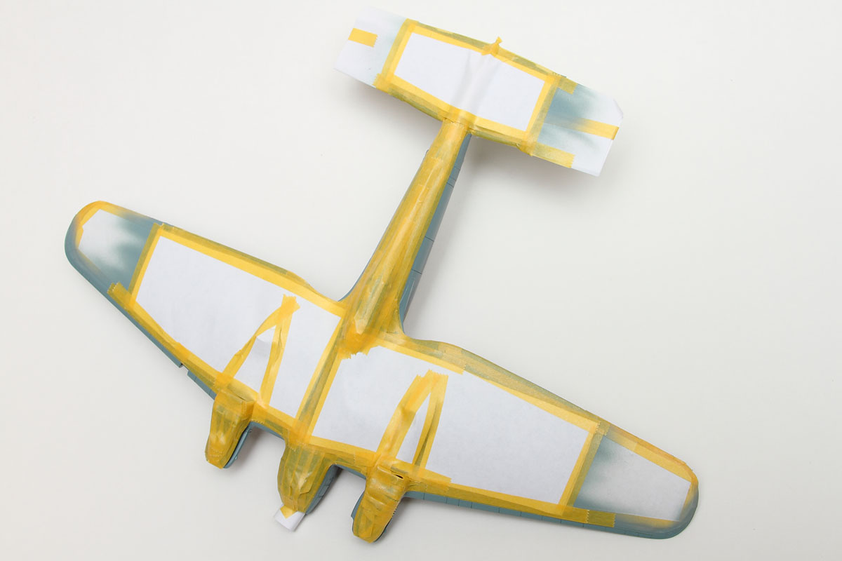 Again, look to use alternate masking sources to limit the amount of tape needed. In the case of the undersurfaces, while the nose, engine nacelles, and rear fuselage were covered with tape, I was able to use paper to cover the bulk of the stabilizers and wings. While this is an effective method, make sure to completely seal all the seams, to avoid potential overspray showing up in odd places. I had to slice the paper around the engine nacelle, and I made sure to tape up those slices, as can be seen here.