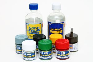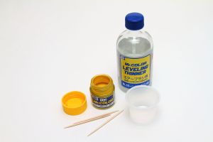 On opening a bottle of Gunze paint, the first thing that one notices is that this is some thick paint. It will need to be thinned quite a bit, and what it is thinned with is just as important as the paint itself. As this is a lacquer-type paint, it dries through solvent evaporation. Ideally, we would want this evaporation to take place after the paint is on the model, so we will want to make sure the thinner used does not evaporate too fast. Gunze has two types of thinner in their lacquer line, and the one we want to use here is the Leveling Thinner. This has a retarder mixed in with the regular thinner to slow its evaporation. If you go with a paint store lacquer thinner, you will want to experiment with it to make sure it does not evaporate too fast.