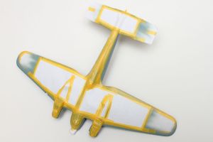 The first color I put down was the white. There are white bands on the tail pieces, and I also used white as an undercoat for the yellow. So I made sure I had a solid layer of white on the tail pieces, while I was less concerned with the thickness of the white on the fuselage and wings. Once the white was on, I needed to determine the order of painting. In order to give myself the best drying times between colors, I determined that the yellow would be the next color to go on. This color, in fact, did not require any masking. However, I did want to protect the tail pieces from potential overspray, so I created simple paper sheaths for the three tailplanes. With those in place, I quickly sprayed the yellow.