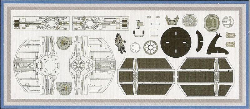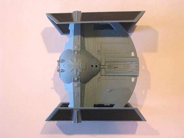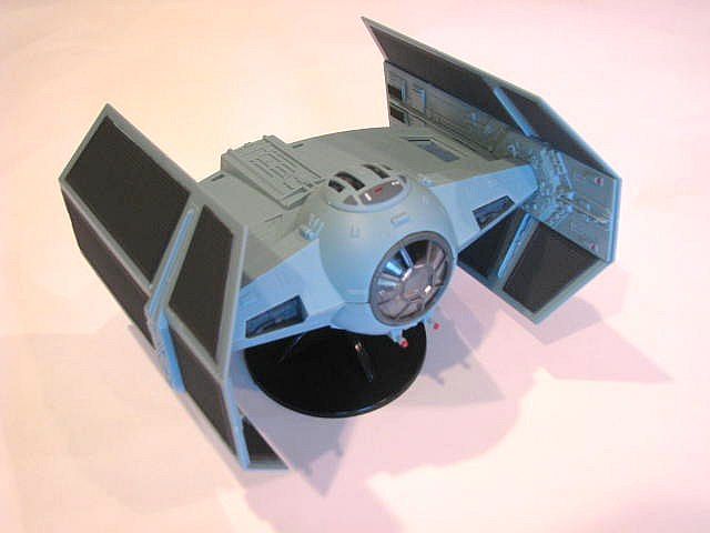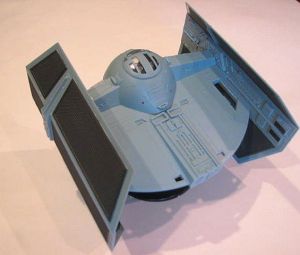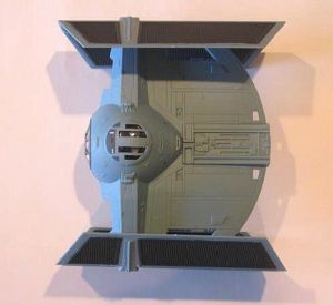 "Darth Vader used this prototype as the basis for the terrifyingly effective TIE interceptor in the Battle of Yavin. Unlike other TIE fighters, this prototype has a deflector shield generator and a simple hyperdrive. Vader's TIE Advanced is armed with heavy twin blaster cannons on fixed mounts but has no life support systems. The TIE Advanced is characterized by a hull of duralloy steel, an extended after deck and unique solar cell wings. The TIE Advanced quickly became one of Darth Vader's favorite ships. Like all TIE ships, the prototype has a drive system consisting of twin ion engines. Its solar ionization reactor is reputed to be much more powerful than the standard TIE fighters. The TIE Advanced has proved itself in battle, as it is capable of withstanding many direct hits. In addition the pilots' chances of survival were considerably enhanced by the incorporation of a hyperdrive system, which enables the ship to escape from battle situations."